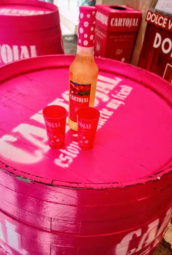 Cartojal: Be ware of the Cartojal! The official feria drink – with the subtle slogan “Estoy de muerte my friend” (I am death my friend). It’s sold by the bottle, chilled, and looks cute and innocent in its polkadotted pink bottle. But don’t be fooled, it hs a alcohol percent of 15% and in the heat it will hit you like a mules kick to the head.